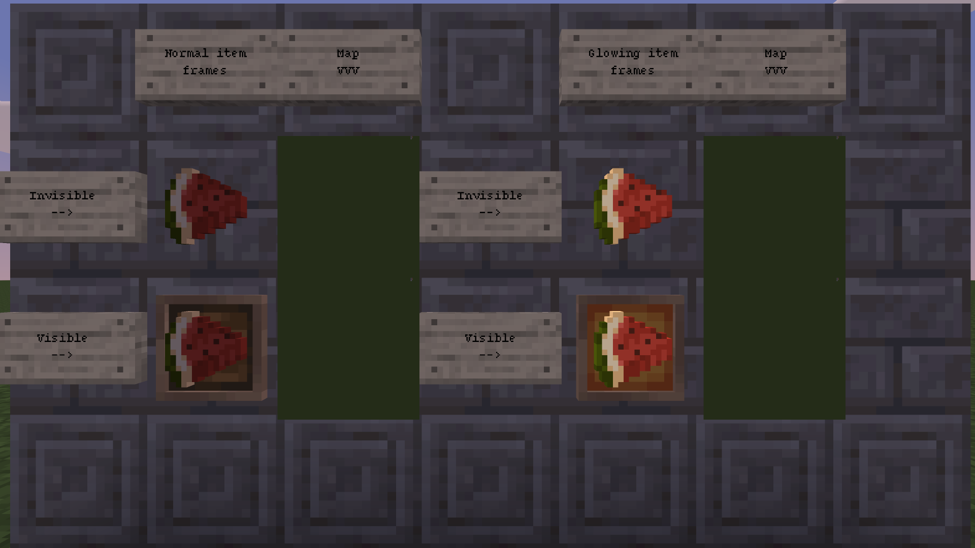 Item frames (both regular and glowing) can also be made invisible in Java Edition via NBT tags inside entity data[2], where they’re widely used for map building and general decoration. However, a Mineclonia item frame consists of a static node (block) for the frame part linked to an item display entity ("wielditem" or "sprite" if it’s a map), meaning the feature requires a separate set of items (nodes) to work.